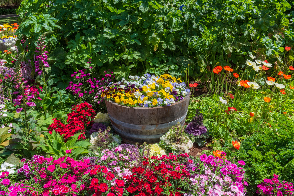 La dernière idée de pot de jardin créatif est ce tonneau surélevé. Placé au milieu du jardin, il devient un éclat de couleur grâce à ces fleurs colorées.