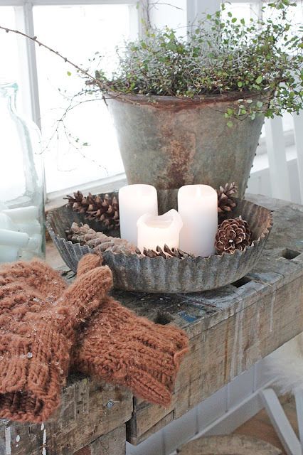 Un centre de table de style rustique avec trois bougies, idéal pour une taverne ou une maison de campagne : la récupération de vieux récipients le permet aussi !