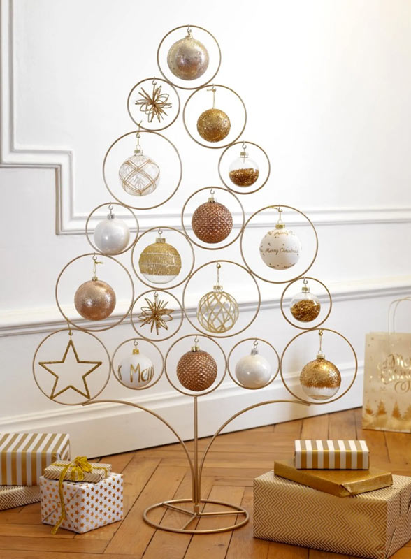 Ce sapin en métal noir est particulièrement design. Les boules décoratives sont accrochées sur les cerceaux qui occupent l’intérieur de la structure. L’étoile est suspendue au sommet tandis que les guirlandes lumineuses soulignent l’allure de l’arbre et l’illuminent de manière indirecte.