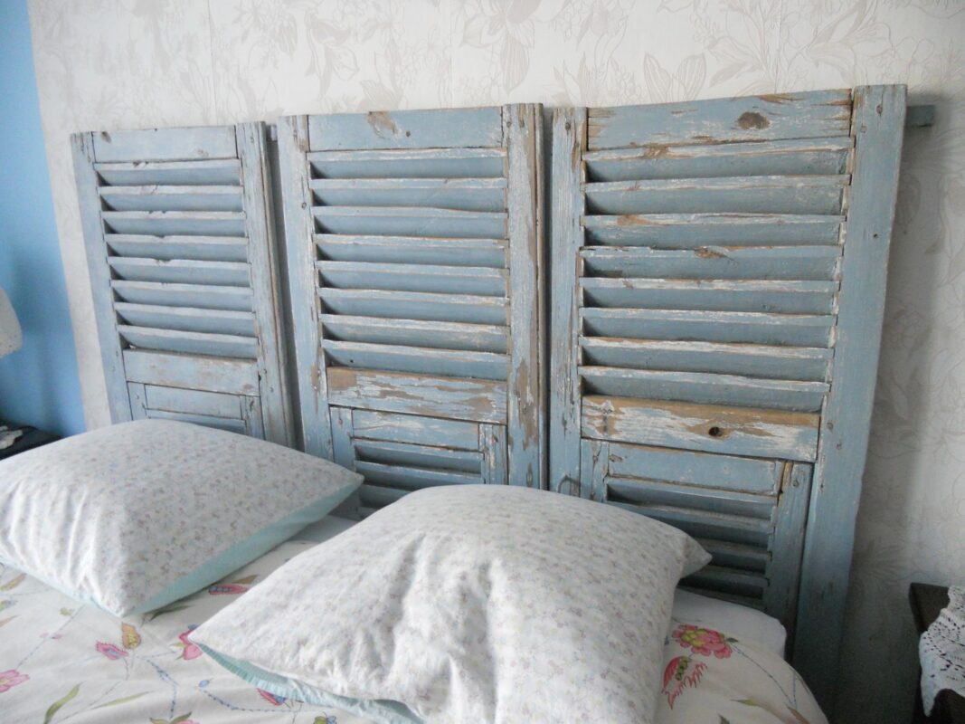 Tête de lit shabby avec de vieux volets bleus.
