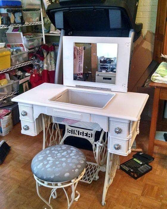 Voici un vrai régal, une idée très créative que vos amis vont vous envier ! Pourquoi ne pas transformer votre vieux Singer en une jolie coiffeuse de style vintage ?